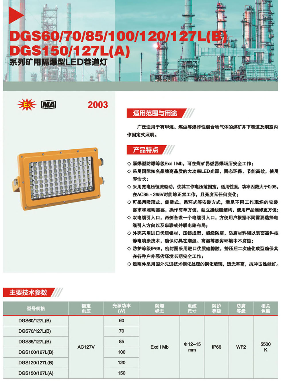 DGS60/70/85/100/120/127L(A)矿用隔爆型LED巷道灯