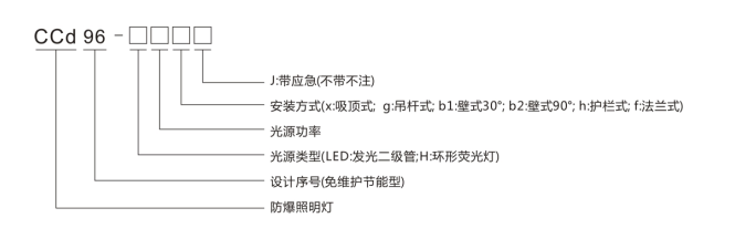 例:如需订购CCD96防爆免维护节能照明灯,配装LED光源15W、壁式安装,带应急功能,则订货型号为"CCD96-LED15bJ